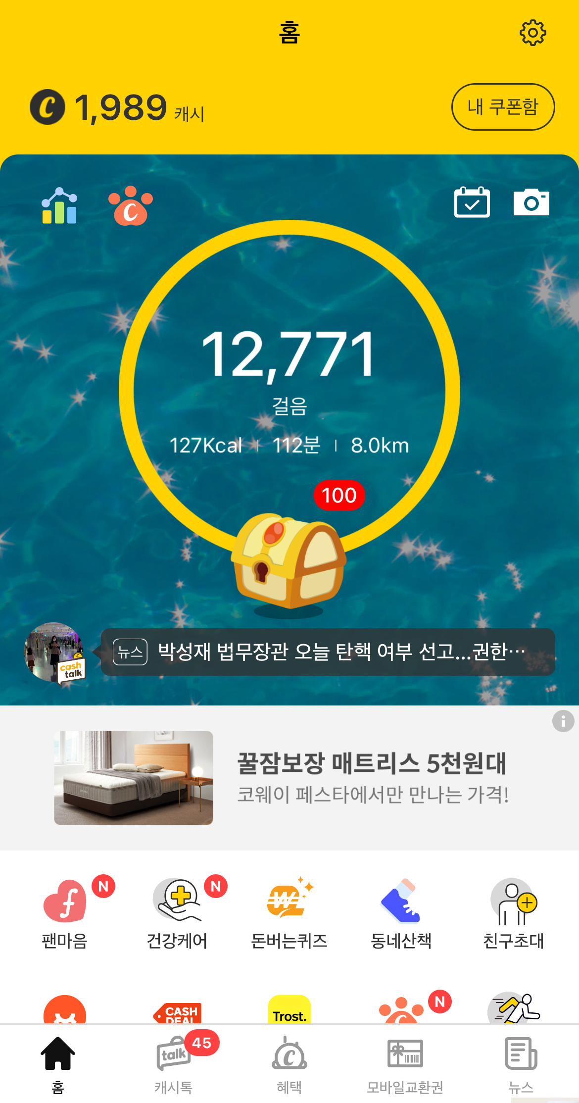 100걸음당 1캐시가 적립되며, 하루 최대 100캐시까지 획득 가능합니다.
