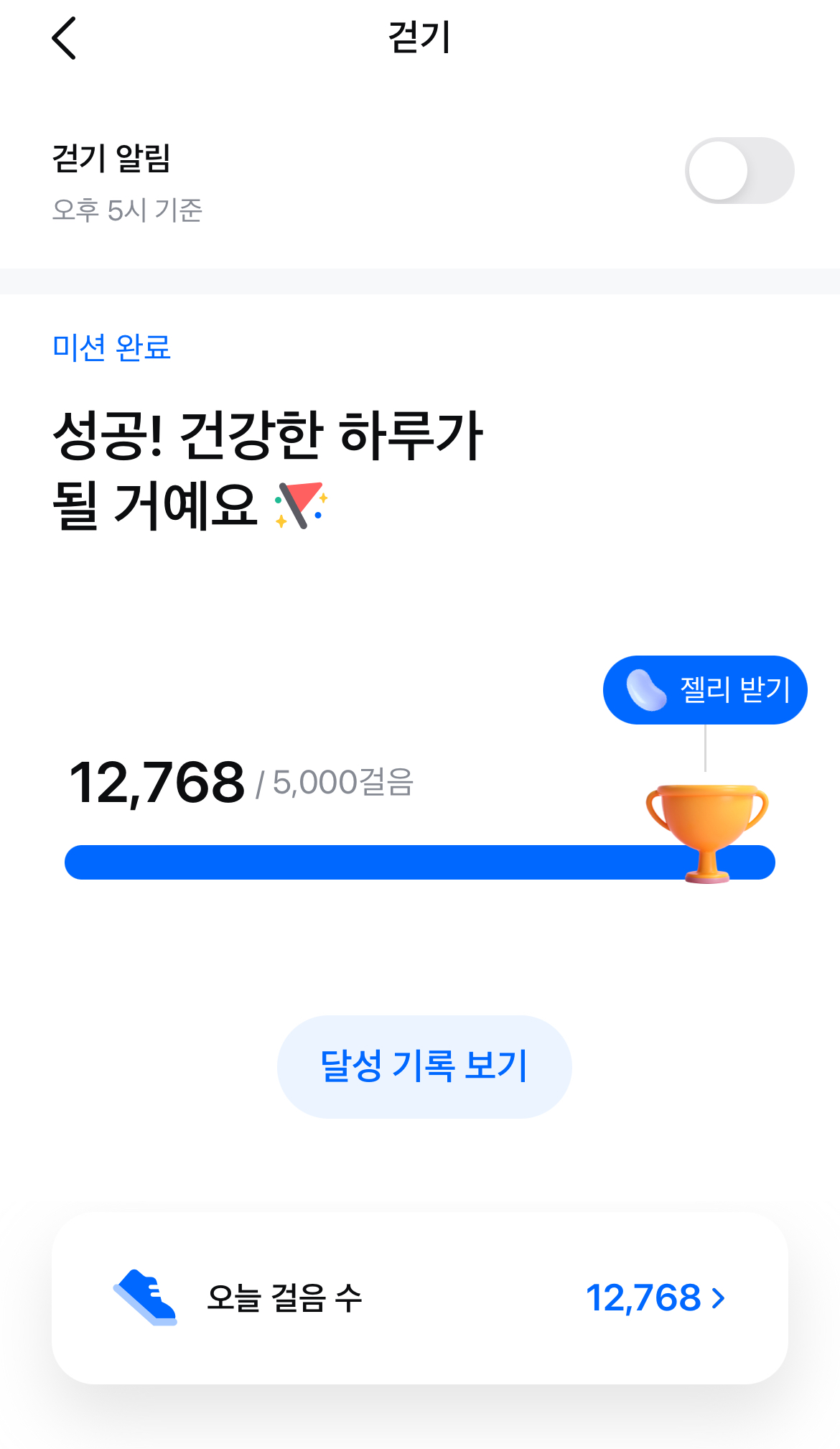 하루 5,000보 이상 걸으면 ‘젤리’라는 포인트를 받을 수 있으며, 이는 현금으로 환급하거나 투자상품으로 전환할 수 있습니다.